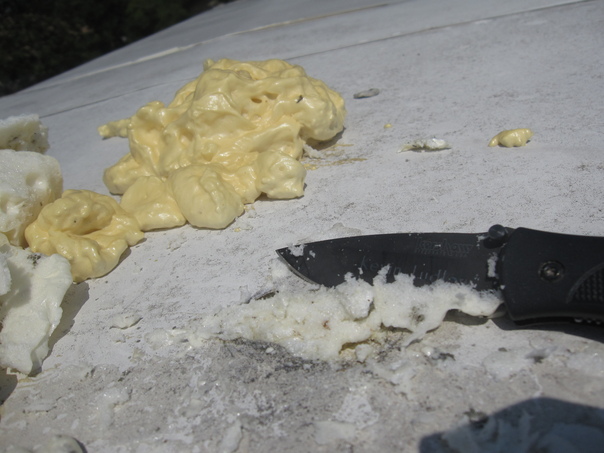 There were two holes on the roof of the coach. I filled both of them with "Great Stuff" insulating foam sealant (courtesy of Mike Crockett) and cut the excess off. I put the nozzle well into the hole and likely filled a good part of our ceiling with it.