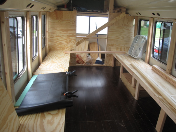 The completed driver's side bench frame from the back of the bus. You can see the polyethylene foam temporarily wrapped around the door frame.