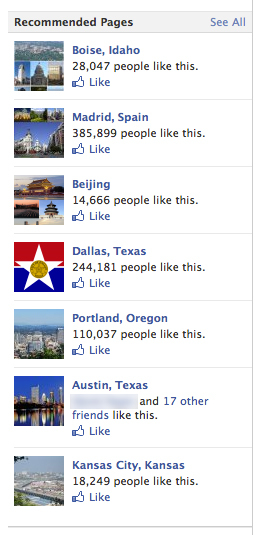 Some of my current recommendations from the Facebook robot. Thus far, my experiment seems to be producing exactly the results I had hypothesized it would. Whatever algorithm(s) Facebook uses to recommend pages is evidently picking up on my colorful assortment of life-changing events. This is a promising start for those interested in reducing what they're worth to Facebook as a human commodity.