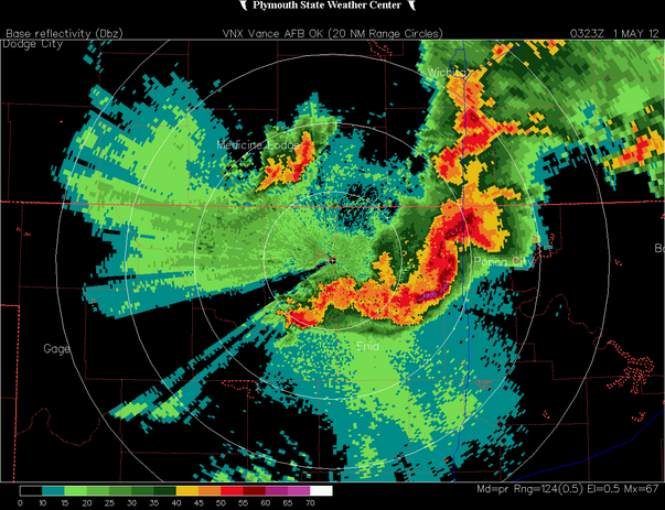An image of the massive cell that developed in about 2 hours time. The blue line on the right of the cell is I-35. We were in the immediate path of this system. We stopped in Norman, Oklahoma around 7pm to grab some dinner and started noticing a rather large cell forming towards Wichita, KS. We figured it would pass before we got that far north. Continuing north on I-35, we started noticing a storm forming in the distance; computer radar confirmed the storm was rapidly expanding to the south. After we saw an actual "StormChaser" vehicle fly past us, we figured there was a pretty legitimate system up ahead. We would later be proven very correct.