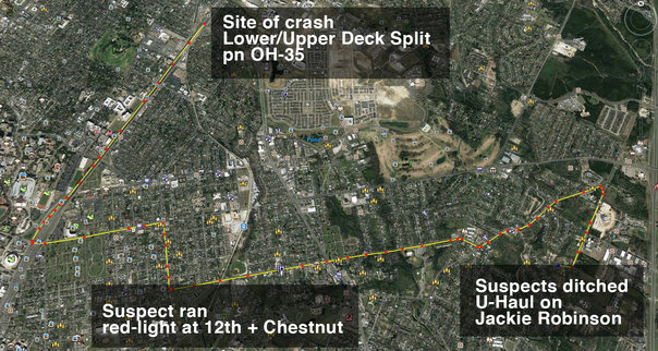 After weaving in and out of traffic, he exited MLK and headed eastbound. He began running red lights, excessively speeding, and clearly trying to get away. Fortunately I know Austin pretty well. I followed him south on Chestnut, east on 12th, northeast on Webberville, south on Tannehill, and finally west on Jackie Robinson. Having destroyed his side mirror in the crash, I purposefully kept my truck to his left so he couldn't see me (hard to see in a U-Haul anyways). By coincidence, he and his passenger pulled over on Jackie Robinson just west of Axel Lane, half a block from property I own. They ditched the U-Haul.