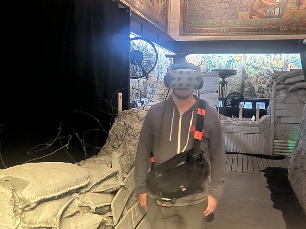 The World War I museum in Kansas City felt the same way. They partnered with him to create what they call War Remains. In short, the experience is a virtual reality assisted walk through the trenches of a World War I battle. Dan Carlin narrates the action happening all around as you explore on your own. A set was built to match the virtual environment and so the person is able to experience the sensation of flying overhead and walking around the battlefield as it rages on.