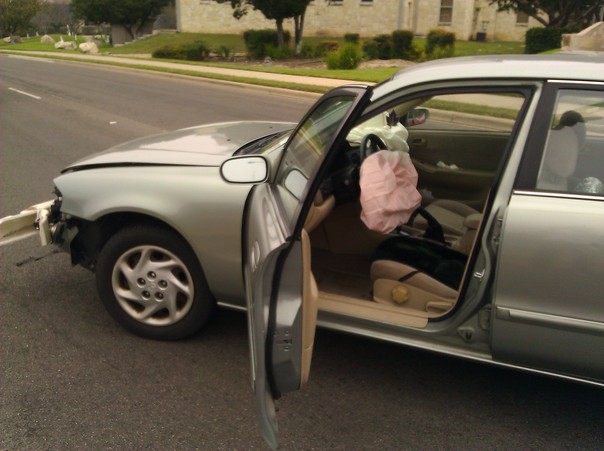 I didn't see the actual impact, but I did come upon the two cars spinning out in the intersection as I came over a hill. An older man was driving the Toyota (in the picture) and apparently cut across an intersection just as a red Corvette was coming down the road. I was later told that the older man mustn't have seen the Corvette and cut right in front of it.