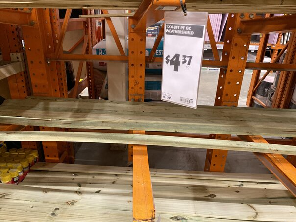 Pallet of pressure-treated "Yellawood" 1x4s at Home Depot