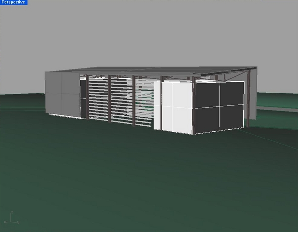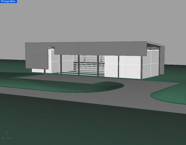 Lenticular Trusses at the Raleigh, NC airport Below are two models (front and rear view) of what the current Axel Warehouse is intended to look like. There is certainly not any granular detail of the actual office space(s), but the shell is pretty easy to visualize. Although I have been looking forward to using the bow-truss system (as described in an older post), it looks like we are now going to use an inverted triangular truss. The system will basically consist of steel beams that lie flat across the roofline. Each of them will have a cylindrical steel column extending down from the middle, with steel tension rods spawning across both sides. I was immediately sold on these after Matt Catterall showed me a picture of them from the Detroit Airport (I am a huge fan of most modern airport architecture).