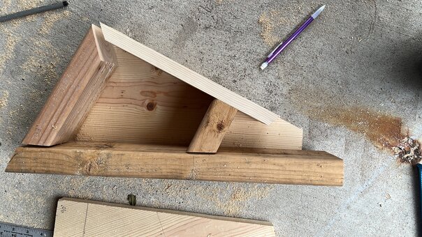 Since the birdhouse has been cut using 63 degree and 27 degree angles, you'll want to set the miter saw for 27 degrees. It's probably going to take a little playing with it to see which direction the molding has to be cut. I found it easiest to cut a piece about 20” long, place it along the front edge it’s going to be affixed to, and then use a pencil to draw the angled direction of cut.