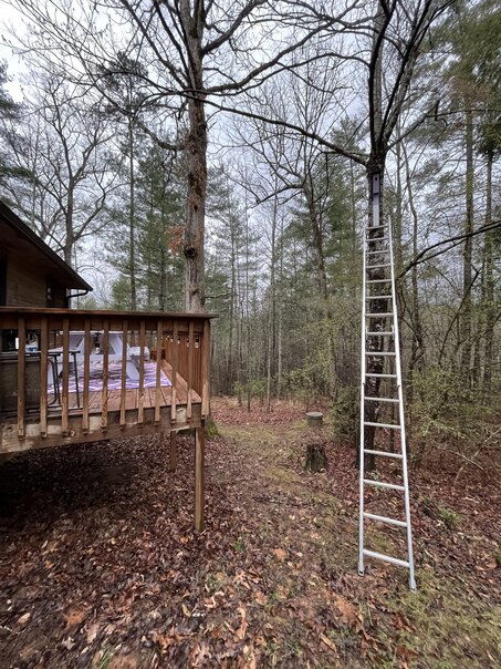 Insert a 3" #10 Spax Construction screw into each of the two holes on the stem. I found it best to get them started so that it was easy to screw them into the tree when I was hanging by the ladder. The two screws along the stem are likely more than enough to affix the birdhouse to a tree, but it's best to use the exposed tie plate as a final mounting hole.