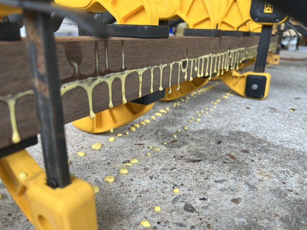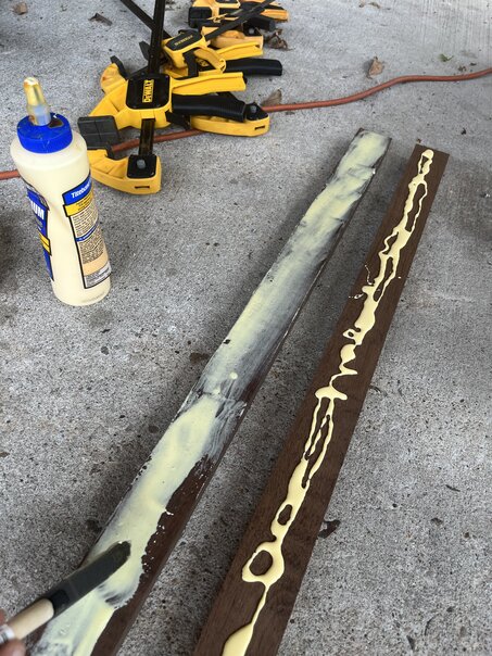 Once I had the pieces cut, we chose the sides that seemed better suited for binding. I poured a generous helping of LockTite wood glue all over both sides, spread the glue with a foam paintbrush, and then put the two pieces together. Proper wood clamps are expensive. Consequently, I only have 12 adjustable DeWalt wood clamps of varying sizes. Those alone probably cost around $500, but I digress. Given that the legs to this easel are each 5'10" (177.8cm) in length and I really wanted to ensure a proper join, I needed to use all 12 clamps per piece. This wasn't a problem, but just meant that I could realistically only build one leg per day.
