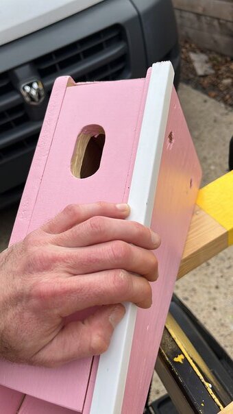 Holding one of the lynch pins against the left side of the door. I wound up placing all of them on the right side of the birdhouses