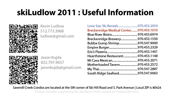 Back of the skiludlow card everyone was given Most everything has already been explained to people individually, but for anyone still on the fence, here are the details and a breakdown of what is included. We will fly into Denver on Wednesday March 23rd, 2011. Depending on the flights available, we will try to arrive between 10am and 1pm MST. We will pick up our rental cars, head into the mountains, and get settled into our condos at Sawmill Creek. Thursday morning we will pick up our ski rentals and then plan to ski all day Thursday, Friday, and Saturday. Per our previous few years, we'll likely try to organize a group trip to Vail on Friday for anyone who is interested in going (our lift tickets will include this in the price). Each day after skiing is usually met with some relaxation, a social hour in the hot tub (with plenty of beverages), and a dinner on the town. For the super-human, Keystone also offers night skiing. As per our custom, we will be planning a large group outing at The Dive Bar on Saturday night. On Sunday morning we will check out, drive back to Denver, and fly back home. What the trip includes