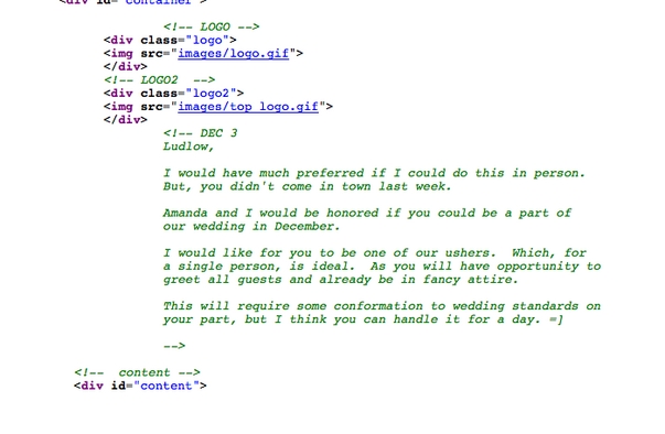 He is always asking me to help him debug his web projects and this one particular morning he asked me if I could check on something. I loaded up a few different tools (namely Firebug) and started prodding away at his markup. Everything looked okay and I couldn't find any problems. He kept insisting there was a problem. Unfortunately I was late to get going and didn't really have time to be messing with his code. After getting frustrated, he asked if perhaps I could just take a look at the source and see if I noticed anything in particular.