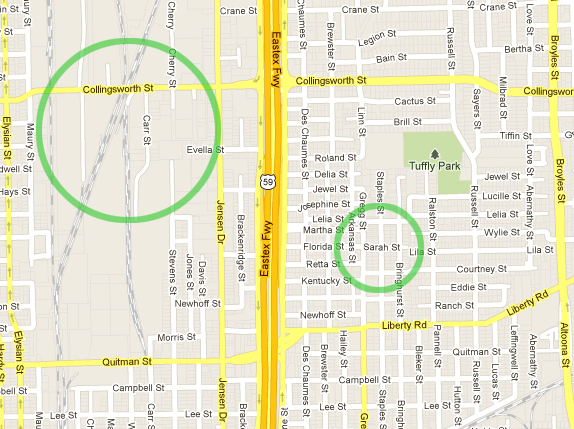 The map showed that there was a tiny road called Sarah Street in northern central Houston, smack dad in the center of the Fifth Ward. It was late at night, probably after 1am, and I called up my dear friend Victor and asked him if he'd join me. He agreed and even drove. We headed out into Houston from Katy, turned up on 59, and drove into the Fifth Ward. The scenery immediately changed.