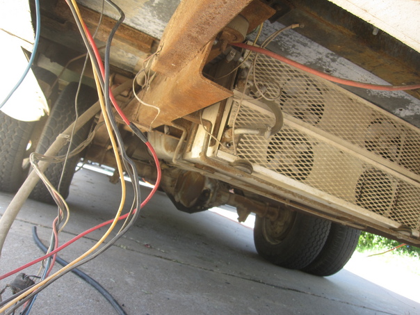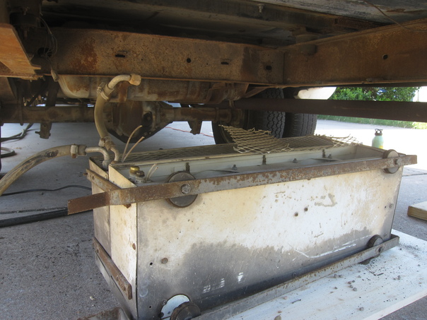 This was no easy feat. The units were underneath the bus, bolted to a frame that was welded to the chassis. The frame was pretty rusted and the entire unit was terribly heavy. It's not the sort of thing you want to be under when it falls. My dad gave me the idea just to use a reciprocating saw with steel-cutting blades to cut the frame out (namely since the bolts were rusted tight), and then to use a stand to catch the unit when it fell.