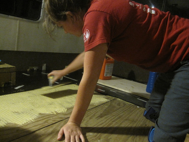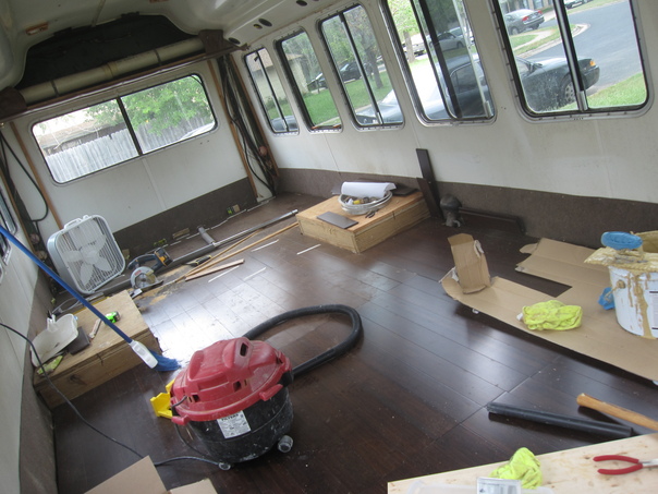 So continuing on with the wonderful bus conversion, we finally have hardwood floors installed! It wasn't quite as trivial as I thought it would be (even having installed a few floors before). The problems mostly arose from the slight curvature of the 3/4" plywood surface, the occasional screw or bolt that had not been fully countersunk, and the glue. I've learned my lesson, I will NEVER glue a floor surface on ever again. The epoxy is not what I thought, is incredibly difficult to work with, and it gets everywhere - including the skin. But fear not because wood glue is one of the easiest glues to remove from one's skin and this is wood glue, no?