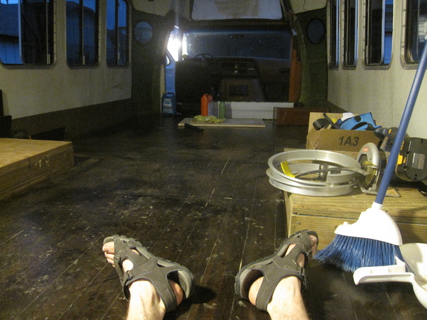 The inside of the bus after completely stripping it down to its 3/4" plywood shell