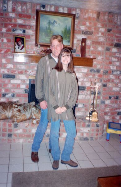 A man and woman both in a similar outfit with blue jeans, long jackets, and brown shoes inside of a brick house.