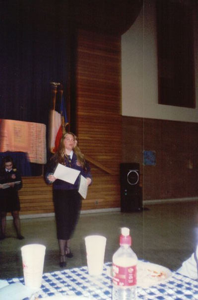 It is a lady with a long skirt in front of a table with a checkered cloth, she's holding papers and is talking.