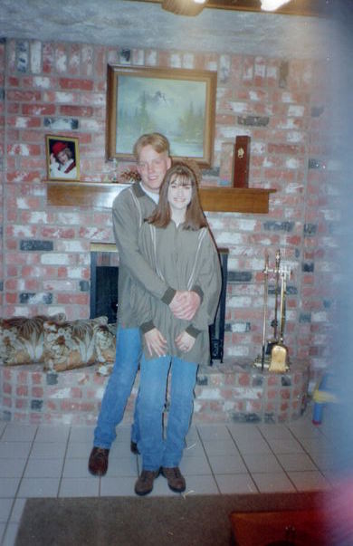 A young couple poses in matching green and black shirts, jeans, and brown boots, in front of a brick fireplace.