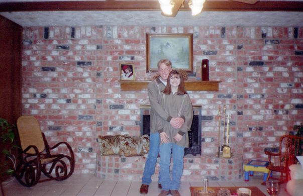 A smiling man holding a smiling woman from behind in front of a brick wall.