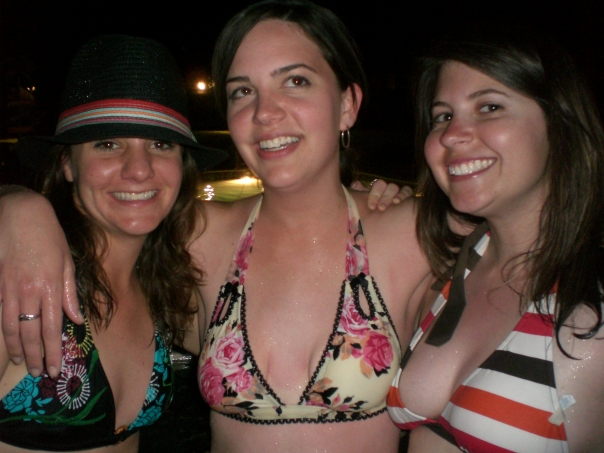 Three binkini clad young woman stand smiling with their arms around eachothers shoulders.