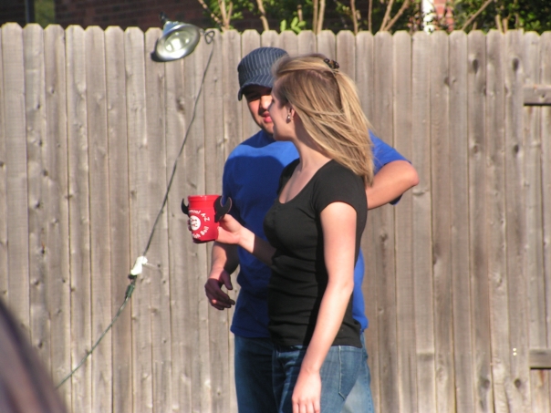 This photo shows a woman in a black shirt with a red cup in her hand, talking to a man in a blue shirt with an unpainted fence and spot light in the background.