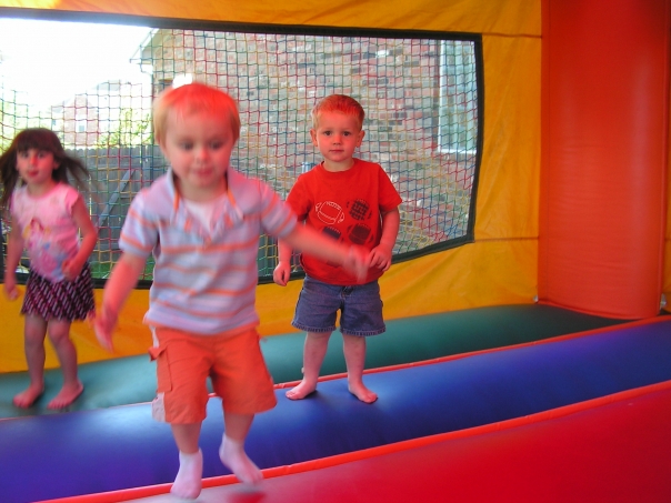 The three toddlers in the jumpee are having so much fun.