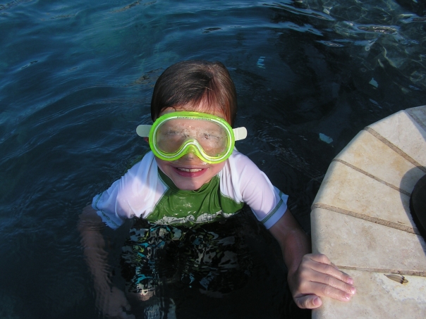 A fully clothed youngster, wearing lime green goggles, takes a swim in a pool.
