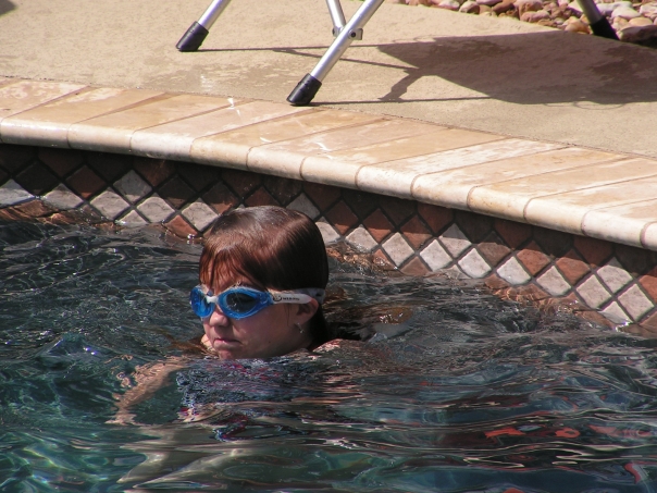 A girl of about 10 years old wearing goggles is seen submerged in a swimming pool up to her chin.