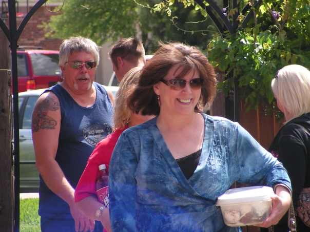 A heavy set woman wearing a blue top and carrying a Tupperware container is leading other people through a wooden fence gate to an apparent outdoor party.