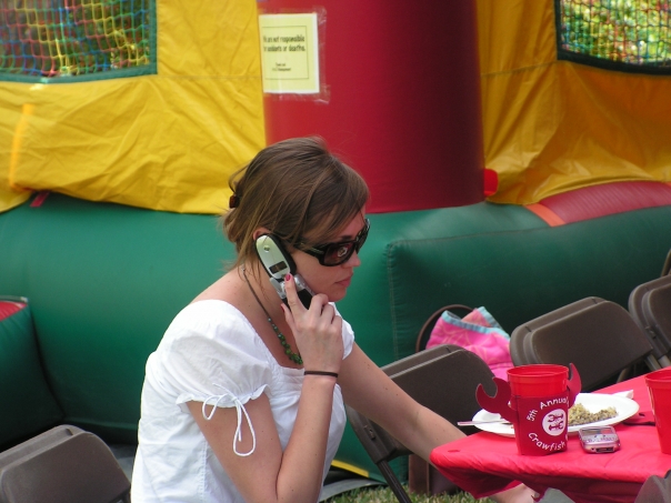 A woman in a white peasant blouse takes a break from fairground activities to talk on a cell phone.