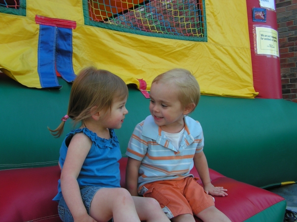 I see two very cute kids looking at each other, outside, full of excitement and laughter.