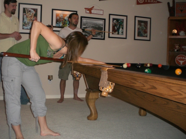 This photo shows a barefoot woman in a green shirt and gray pants about to take a pool shot while men watch in the background.
