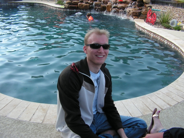 dude in sunglasses hanging out at the pool with his family.