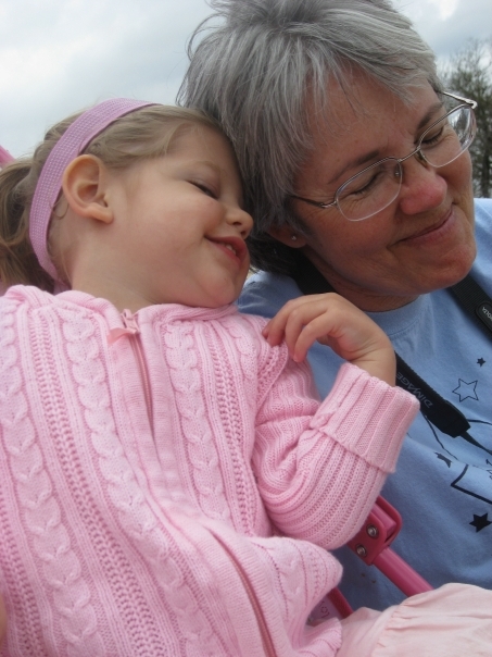 Middle-aged lady in a blue shirt outdoors with a little girl in a pink sweater
