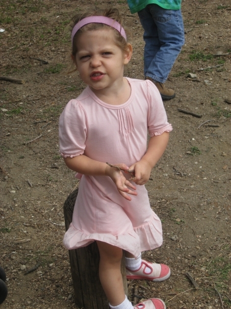 Small girl in pink dress, holding a twig saying "Hey why you taking my picture?"