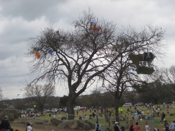 Kite’s landed in a big tree, during a kite show or demonstration.