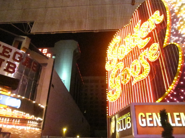 There is a bright, shinning building sign for Golden Goose gentlemens club.