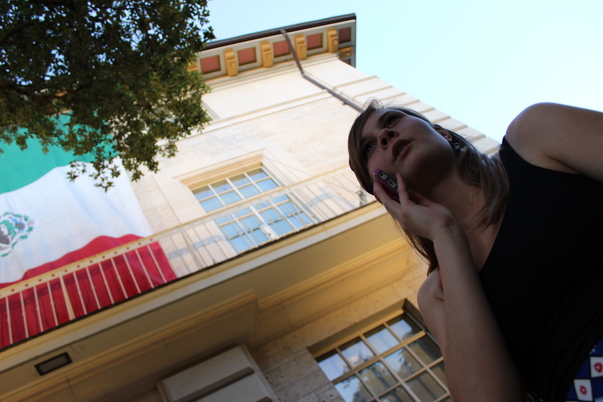 This is a photo of a woman talking on a cellphone outside of a two story building.