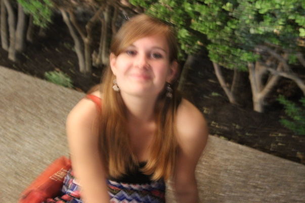 this is a blurry photo of a young woman sitting on the pavement in front of shrubbery.
