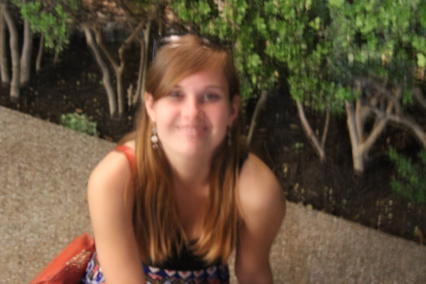 There is a girl with brown hair and an orange bag smiling towards the camera.