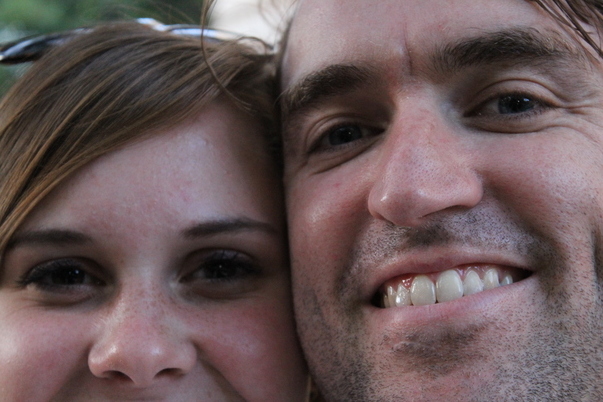 In this picture, a man and a woman are upside down so only their faces and brown hair are displayed.