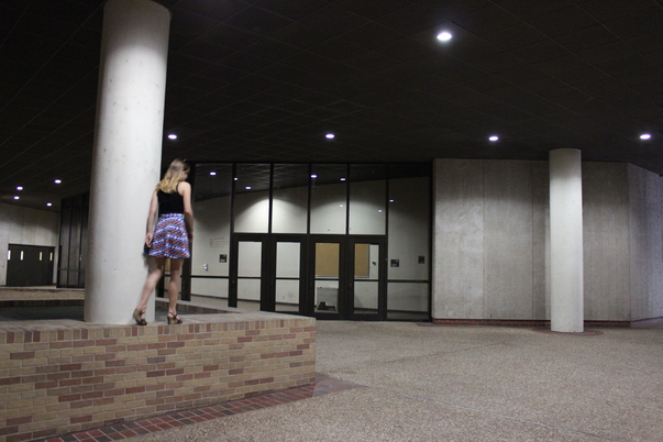 In the nearly empty courtyard in front of a large building with glass doors, a woman strolls along the top of a short brick wall.