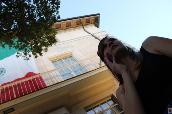 A young lady chats on her cell phone outside on a beautiful, sunny day.