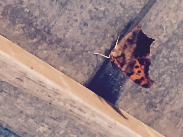 It is a bug that looks as if it's a leaf on a wooden fence.