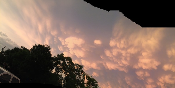 A view of the evening sky filled wth small white clouds and a purple glow.