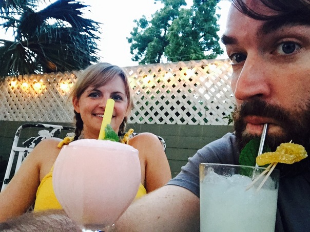 a man and woman enjoying themselves with drinks in a glass A woman in a yellow shirt smiles behind a cool peach looking drink. A white man with a lot of facial hair sips his drink from a silver straw. A man with beard and a blonde girl are seated with cocktails in front of them, and the girl seems to be happy and smiling. There a two couple. The man has black hair and blue t-shirt. The lady has blonde hair and a yellow shirt. They are drinking some kind of drink with ice, both have different drinks and they are drinking out of a straw while sitting down. A young blonde woman in a yellow sleeveless top and young man with a thick brown beard enjoying brightly colored drinks while relaxing in the back yard. A beautiful lady and a young bearded man enjoying spicy, sweet and lemon enriched juice from cute transparent glasses with ice cubes in an open pub. The scenario is enhanced with the trees and lights. The man and woman recline in front of the green and white fence as the sun goes down, sipping on ice cold cotton candy colored drinks. The young man and woman smiling and enjoying cold drink and ice-cream on a bright sunny day at the restaurant. Sitting