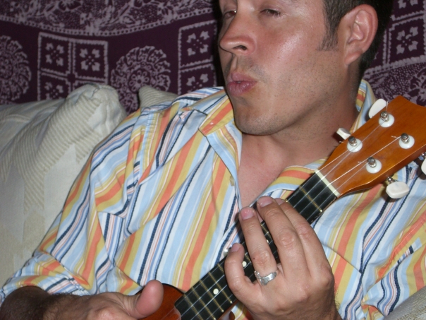 A fellow strumming his ukulele while crooning a romantic song, I wonder to who?