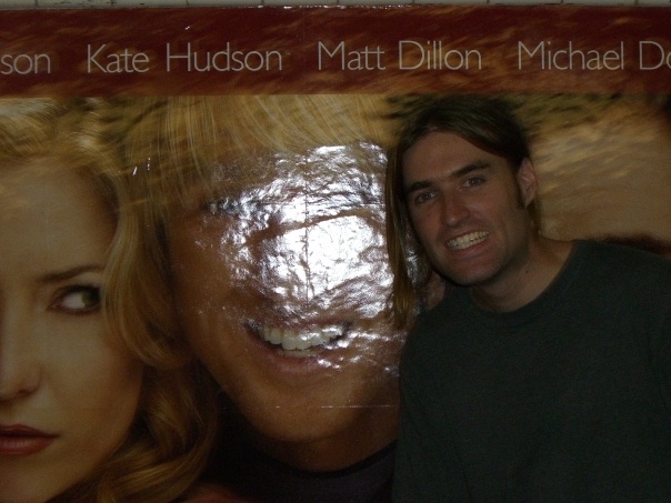 This handsome man is smiling like a Cheshire cat, as he is trying to fit in with the poster on the wall.