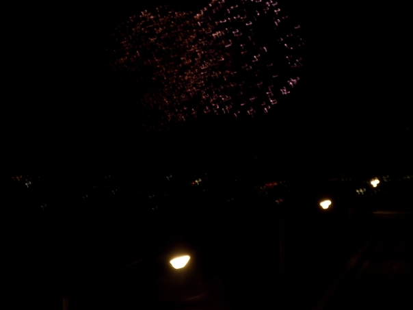 On a dark night, fireworks go off in this photo taken from the ground.