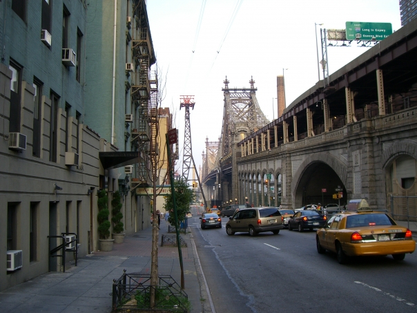 A stone bridge, powerlines, and tall apartment buildings block the sun from reaching the street where cars and taxis are driving.